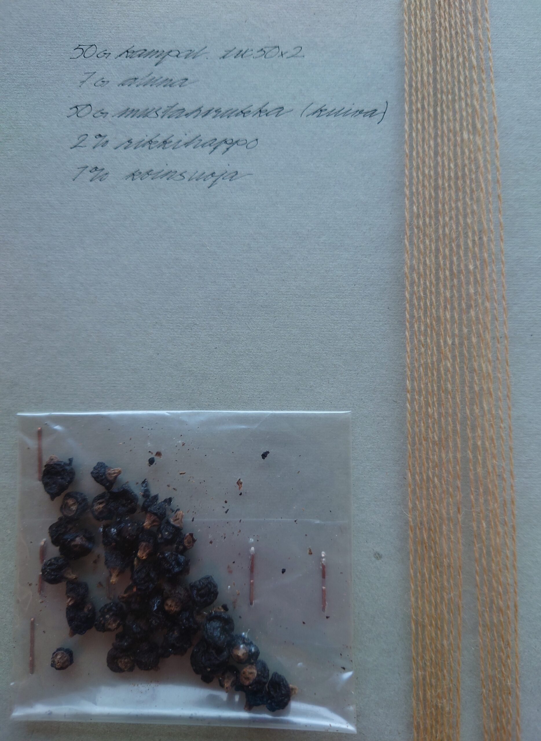 Löysin kansioista useita marjoilla värjättyjä lankanäytteitä. Eri marjat tummansinertävine sävyineen ovat houkuttaneet aloittelevia värjäreitä kautta aikojen. Kädentaitoalaa opiskellessa tehdään myös paljon testivärjäyksiä, joilla voidaan todentaa erilaisten väitteiden paikkansa pitävyys.