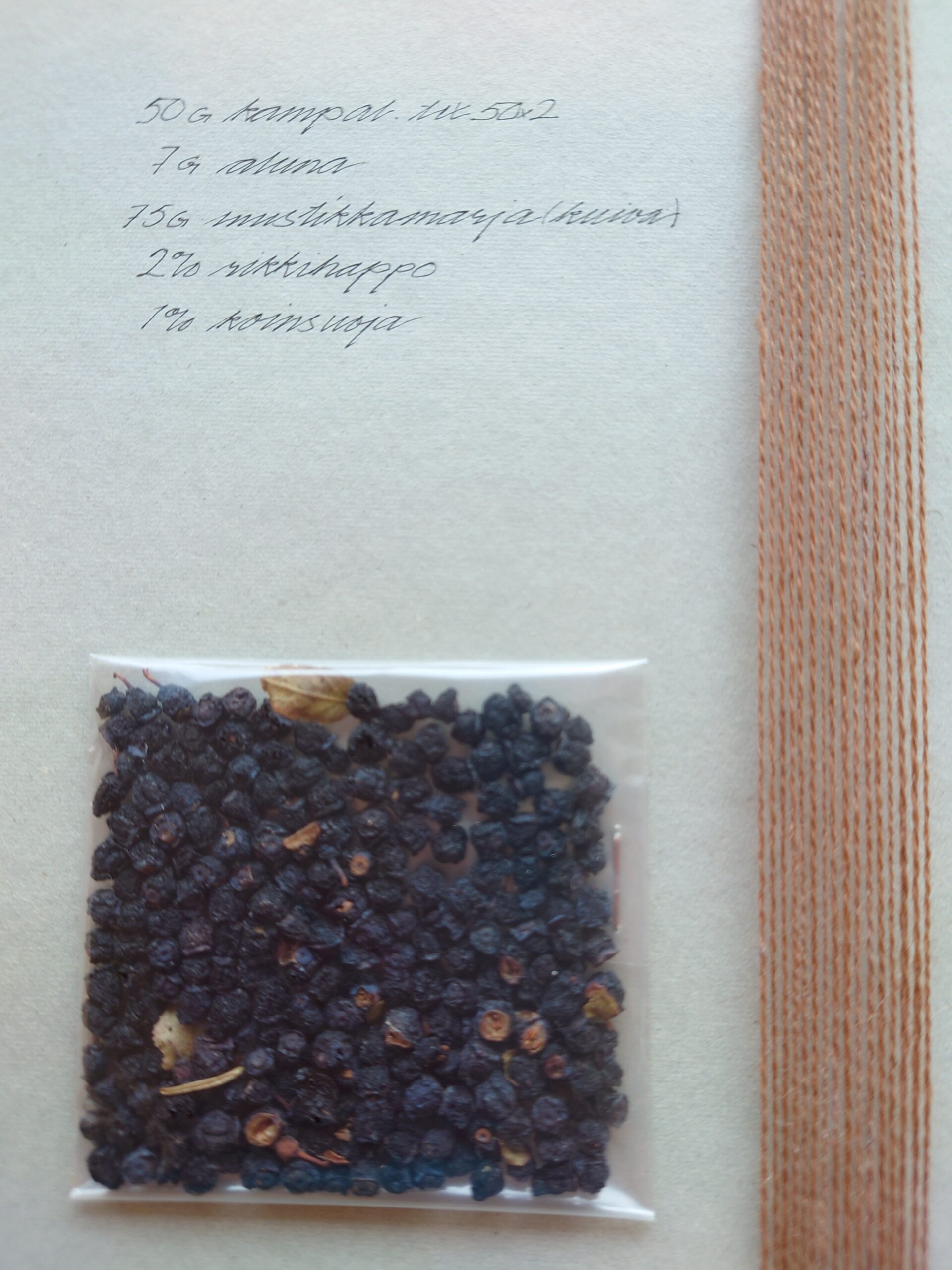 Alunaa on käytetty 16 prosenttia ja rautavihtrilliä 14 prosenttia. Nykytutkimusten mukaan 10 % alunaa ja 1–3 % rautavihtrilliä riittää. Kasvimassaa käytetään sen sijaan enemmän. Näytteessä langan ja kasvimassan suhde on 1:5. Useimmiten esimerkiksi kursseillani värjätessä käyttösuhde on 1:10. Mitä enemmän kasvia, sen enemmän myös väriä.