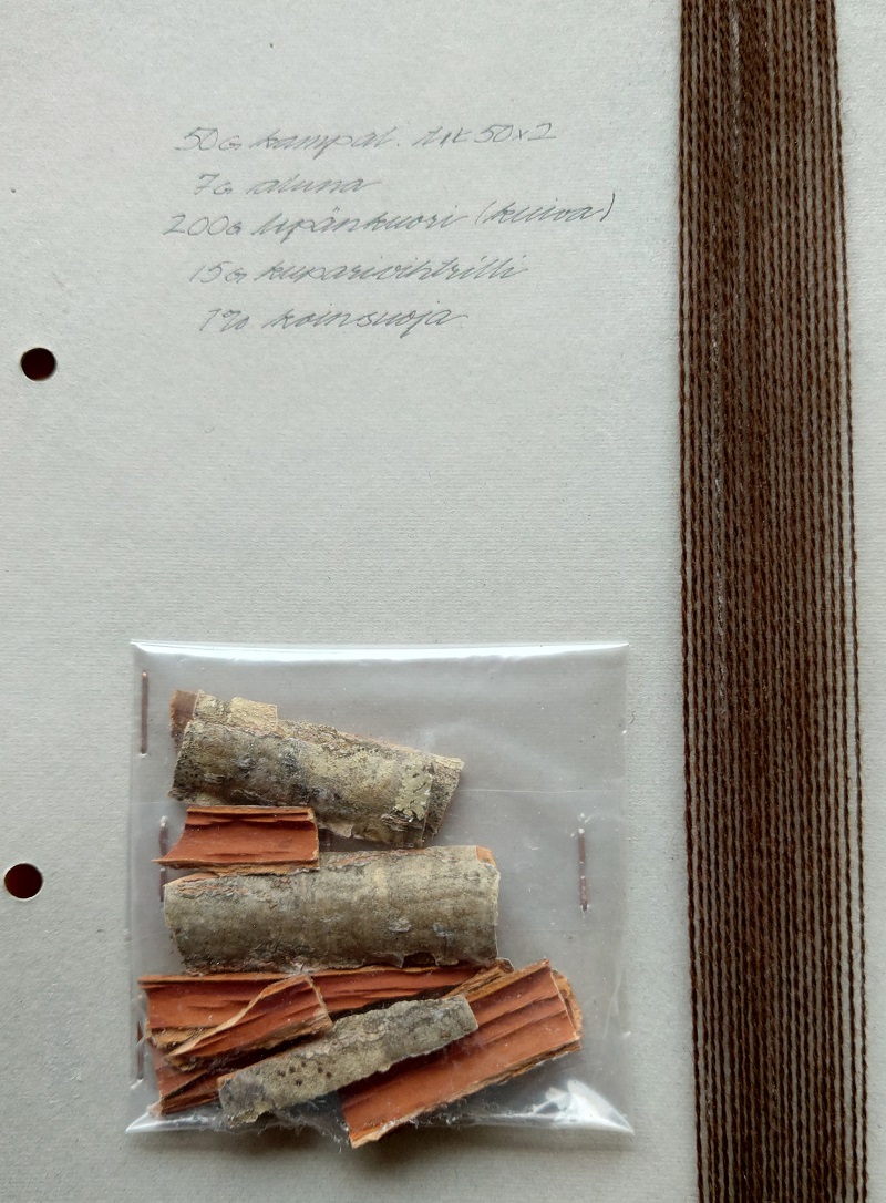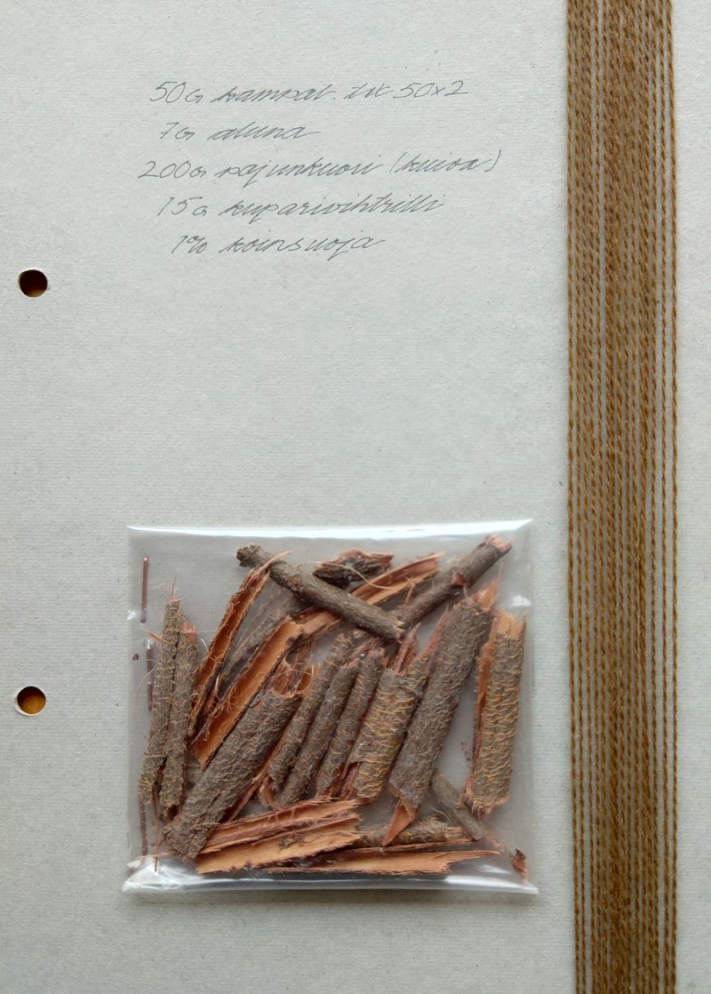 Paatsaman kuoren lisäksi näytteistä löytyi myös kaksi muuta kuoresta irrote ttua väriä: pajun ja lepän kuori. Molempia oli käytetty suhteessa 4:1 eli 200 g kuivaa kuorta / 50 g lankaa.
